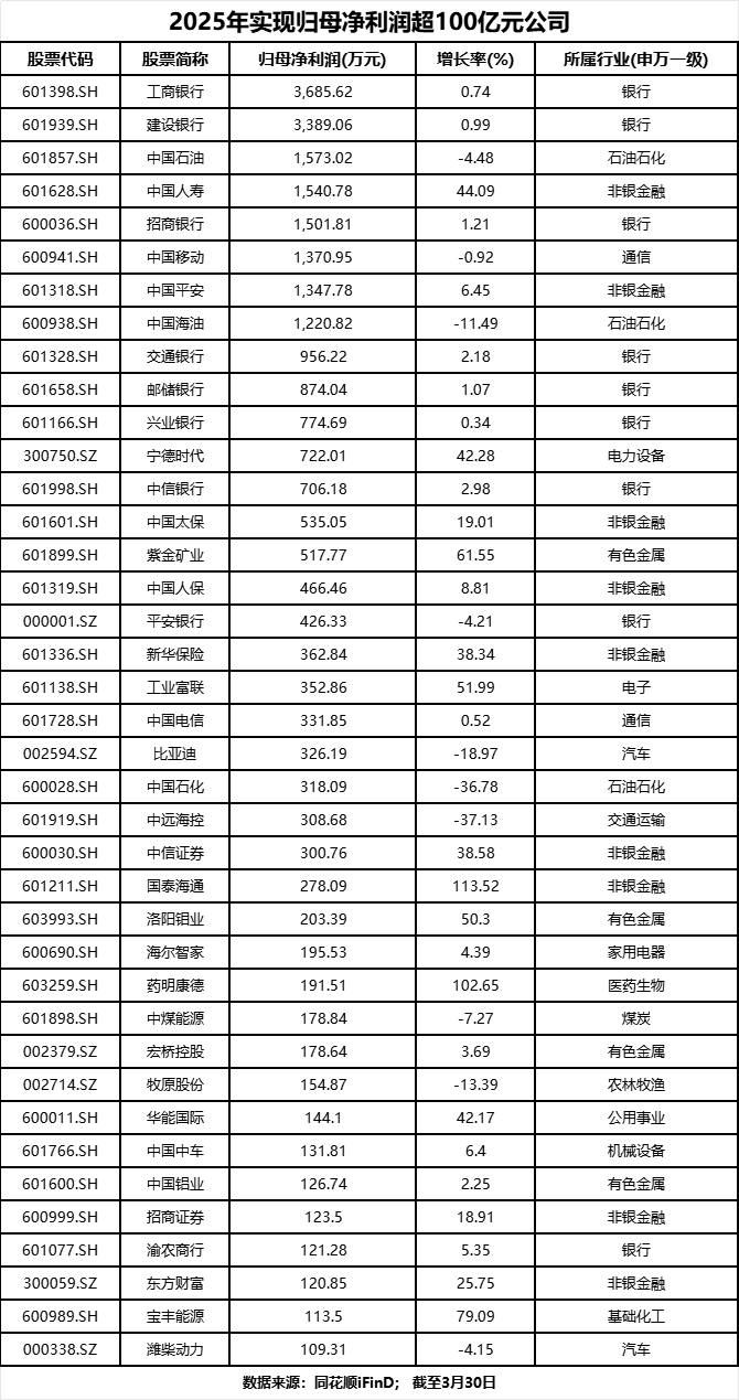 工商银行以3685.62亿元净利润稳居第一,同比增长0.74%;建设银行以3389.06亿元位列第二,同比增长0.99%,两大国有大行持续领跑A股盈利榜。中国石油以1573.02亿元净利润排名第三,中国人寿、招商银行分别以1540.78亿元、1501.81亿元跻身前五,净利润均超1500亿元。