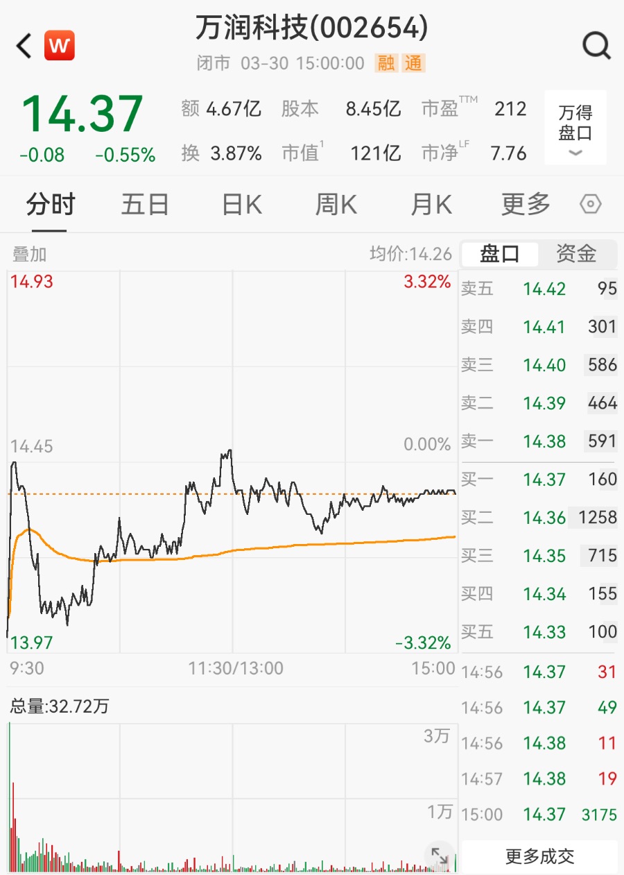 截至3月30日收盘,万润科技股价报14.37元/股,跌0.55%。