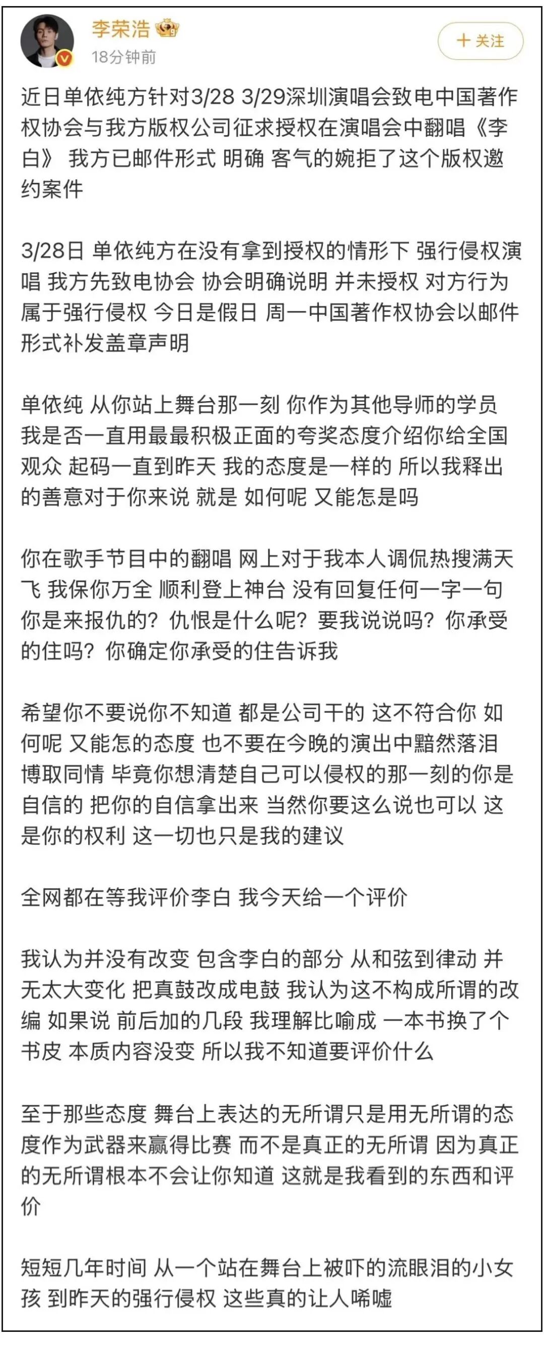 3月29日,李荣浩发文回应单依纯演唱会翻唱《李白》争议。