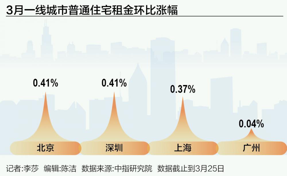 受访专家表示,受季节性因素影响,春节假期后住房租赁市场热度总体回升,北京等一线城市市场整体呈现“需求快速回归、租赁节奏加快”的特征。中指数据显示,3月北京、上海、广州和深圳普通住宅租金环比分别上涨0.41%、0.37%、0.04%和0.41%。