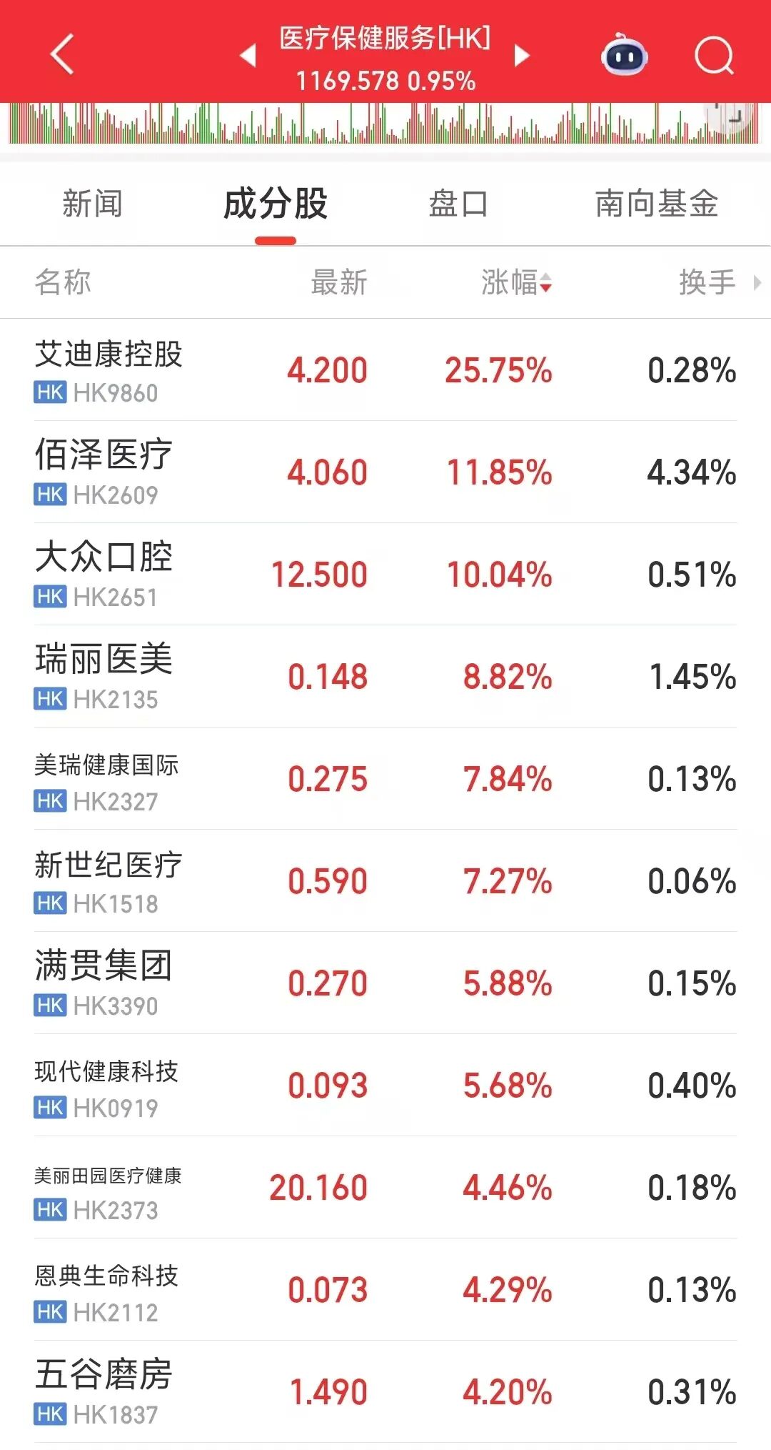 医疗保健服务概念股走强, 艾迪健康控股涨超25.75%,佰泽医疗涨超11%, 大众口腔涨超10%,瑞丽医美涨超8%。