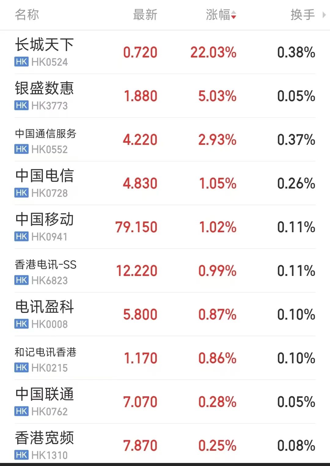 电信概念股拉升。 长城天下涨超22%,中国电信、中国移动涨超1%,中国联通上涨0.28%。
