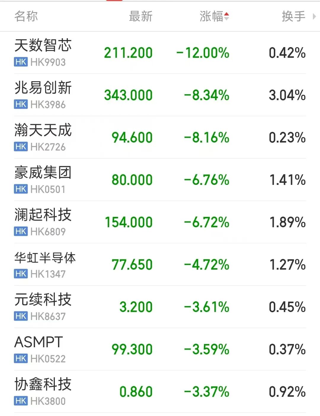 半导体芯片概念股领跌, 天数智芯跌12%,兆易创新跌超8%,澜起科技跌超6%,华虹半导体跌超4%。