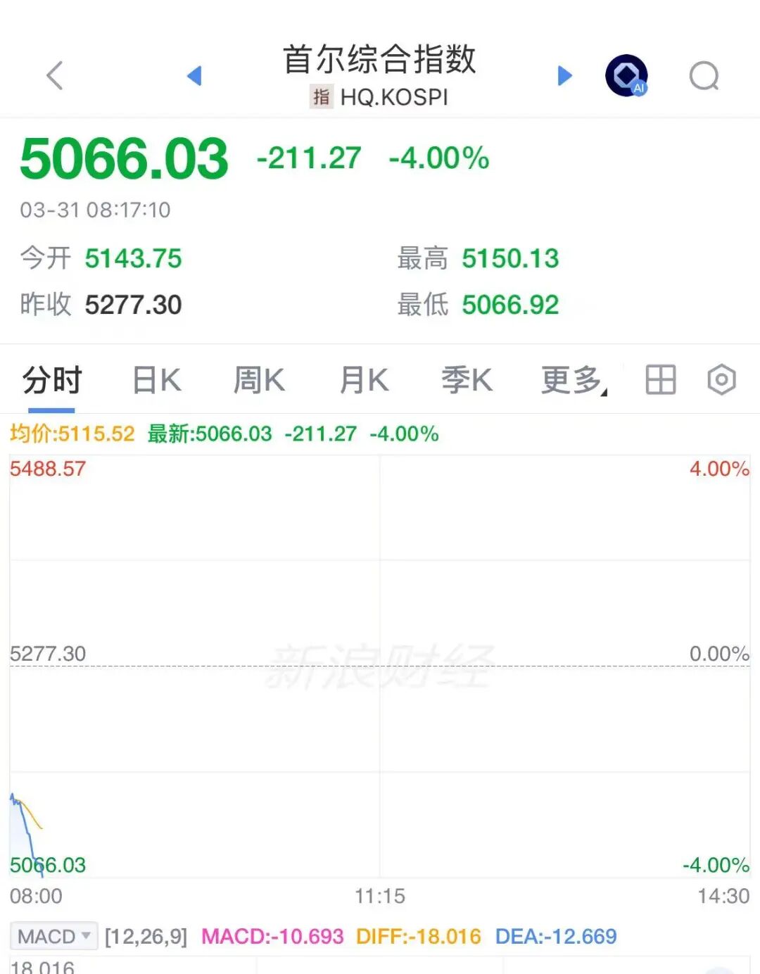3月31日,日韩股市低开。截至8点17分,日经225指数向下跌破51000点,日内下跌2.5%;韩国KOSPI指数跌幅扩大至4%,报5066点。