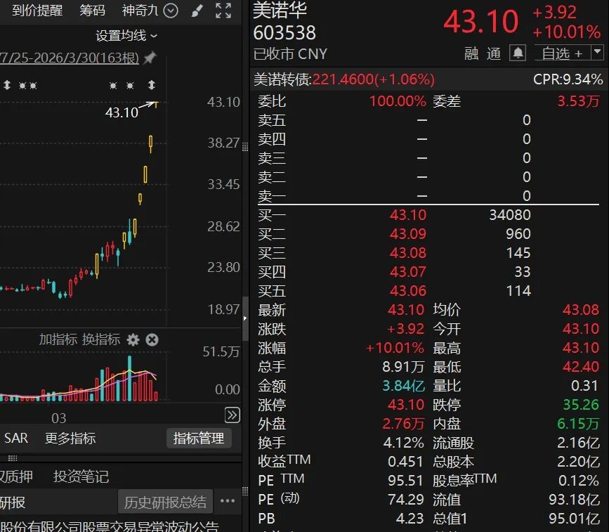 3月30日,美诺华(603538)再度涨停收盘,上演5连板。也是公司最近7个交易日内,第6次涨停收盘。