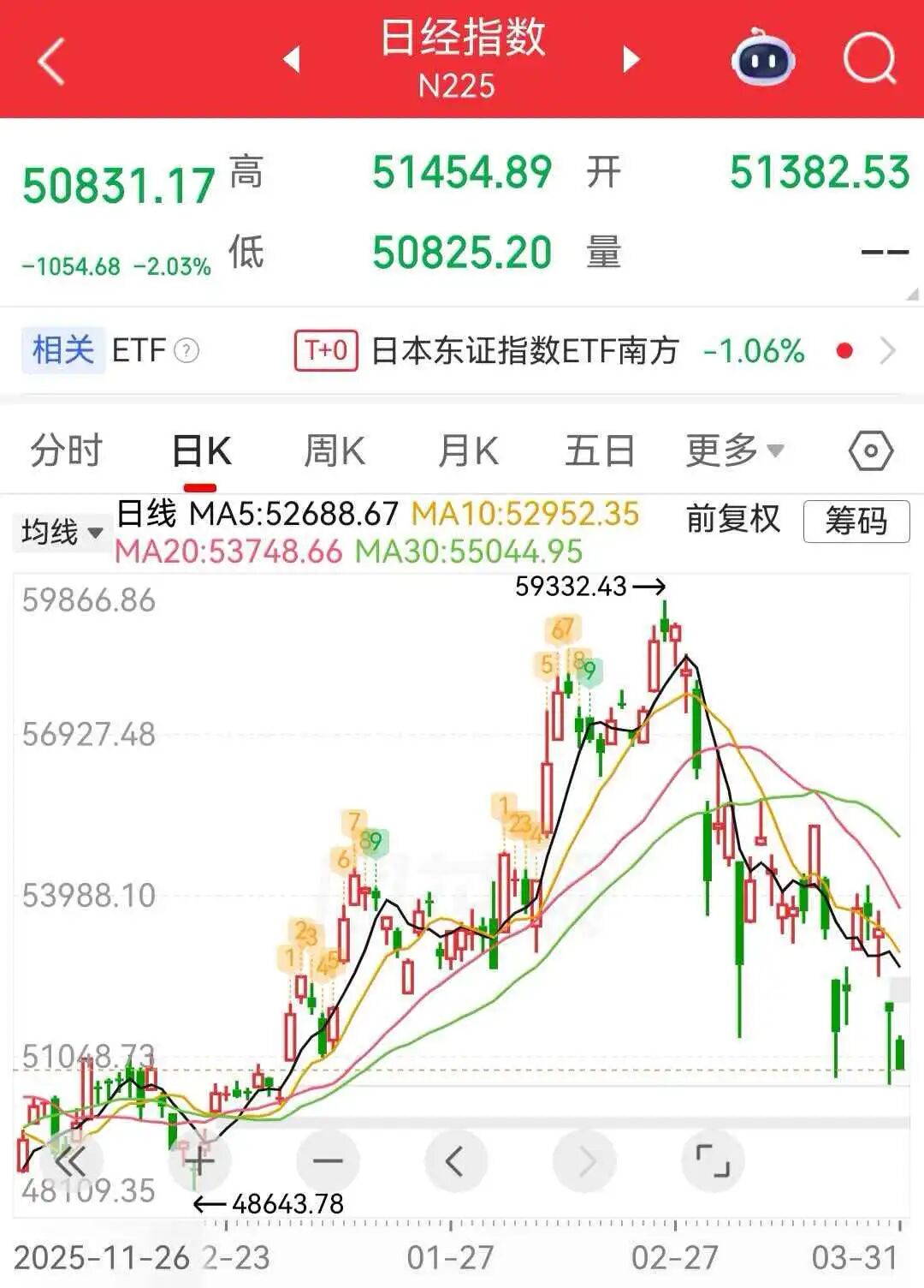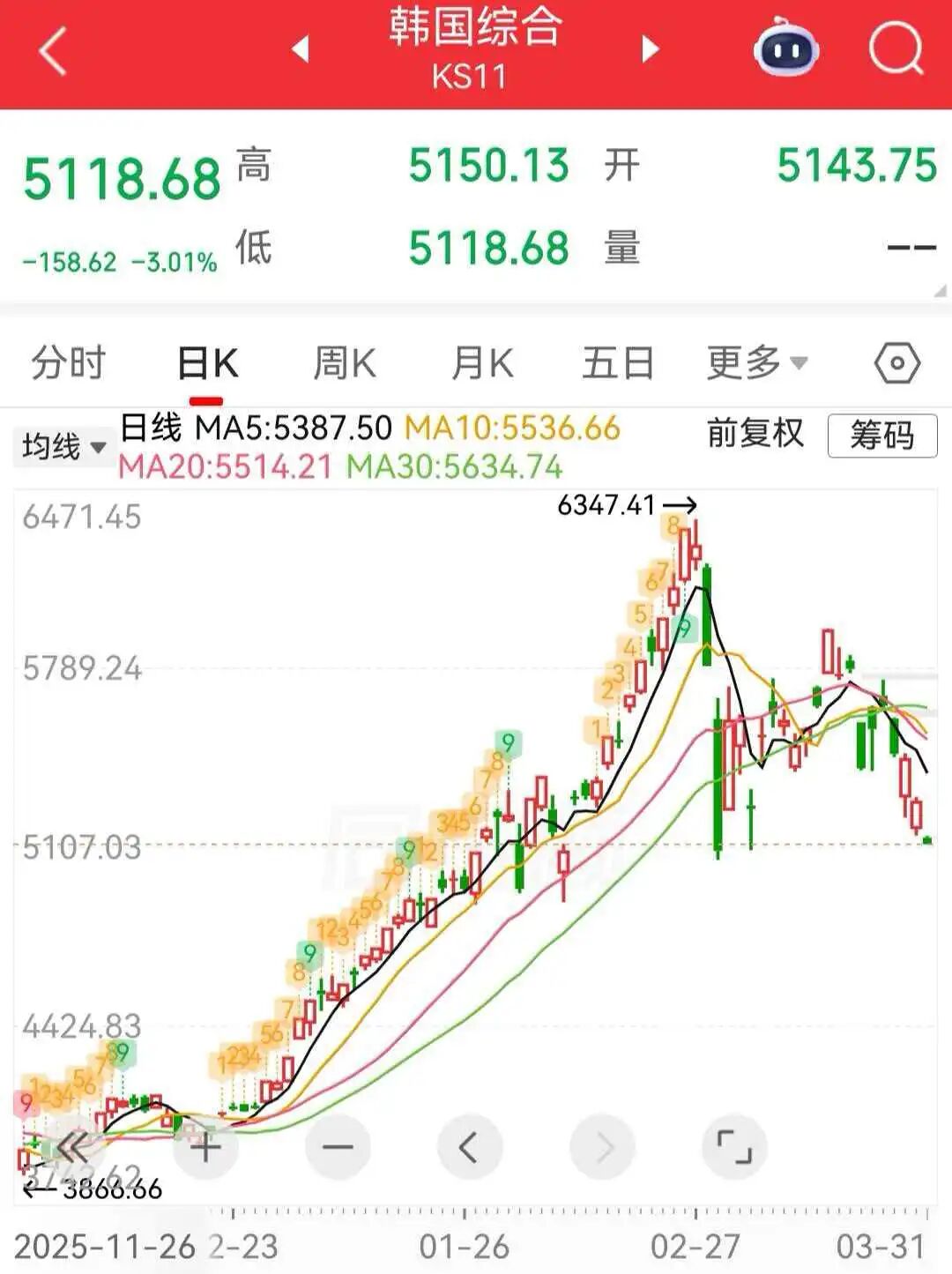 3月31日, 日韩股市低开, 日经225指数开盘下跌0.97%,报51382.53点;韩国KOSPI指数跌2.53%,报5143.75点。