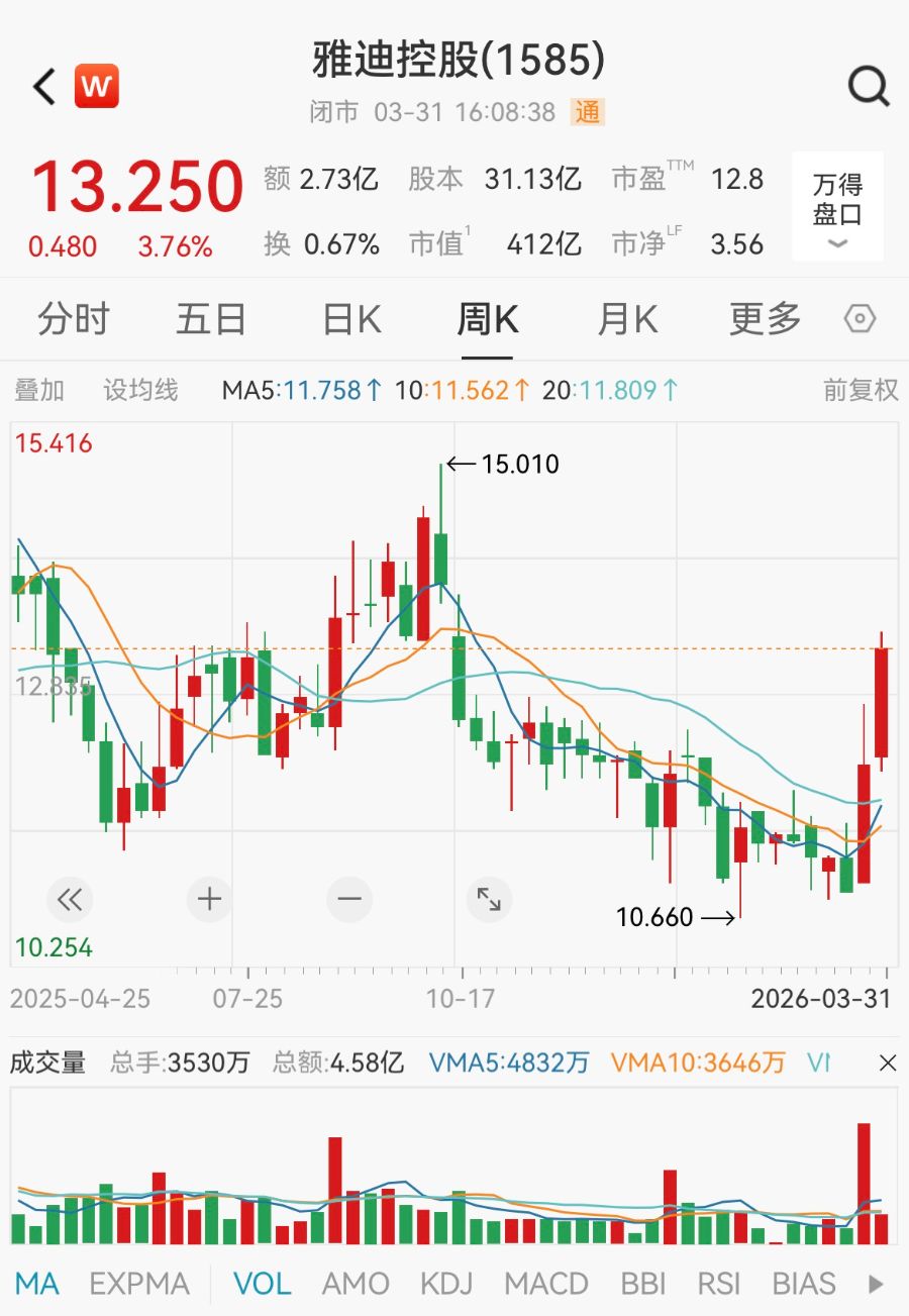 雅迪控股(1585.HK)2025年总营收370.08亿元,同比增长31.1%,2025年净利润29.12亿元,同比增长128.83%,拟每股派息0.53港元。截至3月31日收盘,雅迪控股涨3.76%,报13.25港元/股,市值约412亿港元。