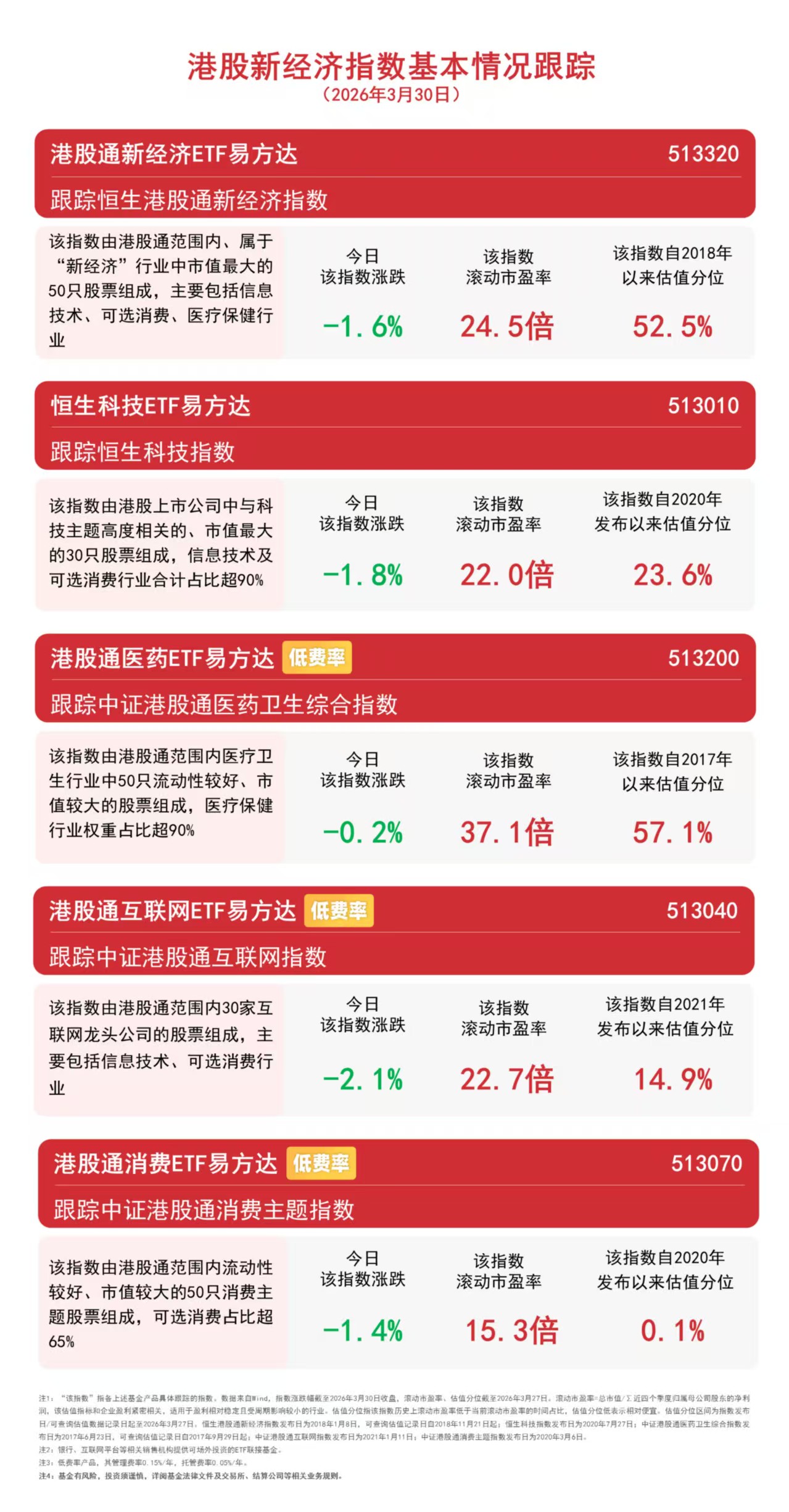 截至收盘,中证港股通医药卫生综合指数下跌0.2%,中证港股通消费主题指数下跌1.4%,恒生港股通新经济指数下跌1.6%,恒生科技指数下跌1.8%,中证港股通互联网指数下跌2.1%。Wind数据显示,截至上周五,恒生科技ETF易方达(513010,联接基金A/C:013308/013309)近一月“吸金”超20亿元。