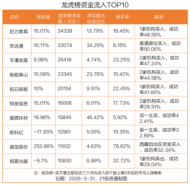 3月31日,上证指数下跌0.8%,深证成指下跌1.81%,创业板指下跌2.7%。盘后龙虎榜数据显示,共有48只个股因当日异动登上龙虎榜,资金净流入最多的是巨力索具(002342.SZ),达3.43亿元。
