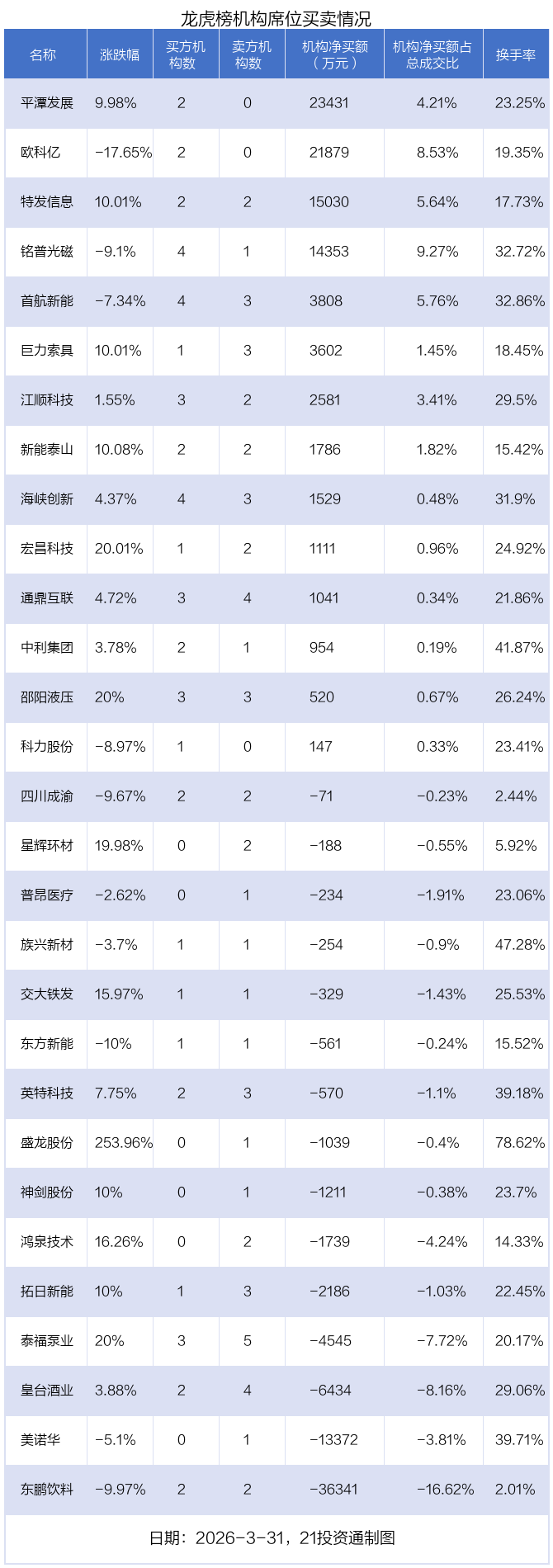 3月31日,29只个股龙虎榜出现了机构的身影,机构合计净买入2.27亿元。具体来看,机构净买入14股,净卖出15股。
