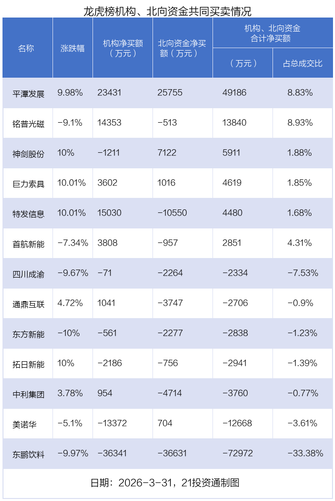 值得注意的是,机构和北向资金共同净买入了平潭发展、巨力索具等2股;共同净卖出了拓日新能、四川成渝、东方新能、东鹏饮料等4股;在神剑股份,美诺华,铭普光磁,首航新能,通鼎互联,中利集团,特发信息上出现分歧,机构净卖出神剑股份1210.97万元,北向资金净买入7122.08万元;机构净卖出美诺华1.34亿元,北向资金净买入704.29万元;机构净买入铭普光磁1.44亿元,北向资金净卖出513.3万元;机构净买入首航新能3807.92万元,北向资金净卖出956.9万元;机构净买入通鼎互联1041.18万元,北向资金净卖出3746.89万元;机构净买入中利集团954.02万元,北向资金净卖出4714.29万元;机构净买入特发信息1.5亿元,北向资金净卖出1.06亿元。