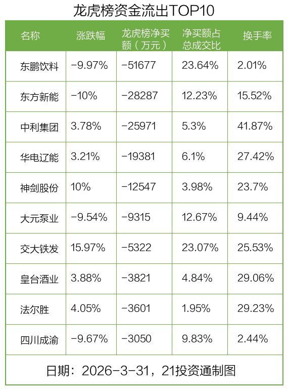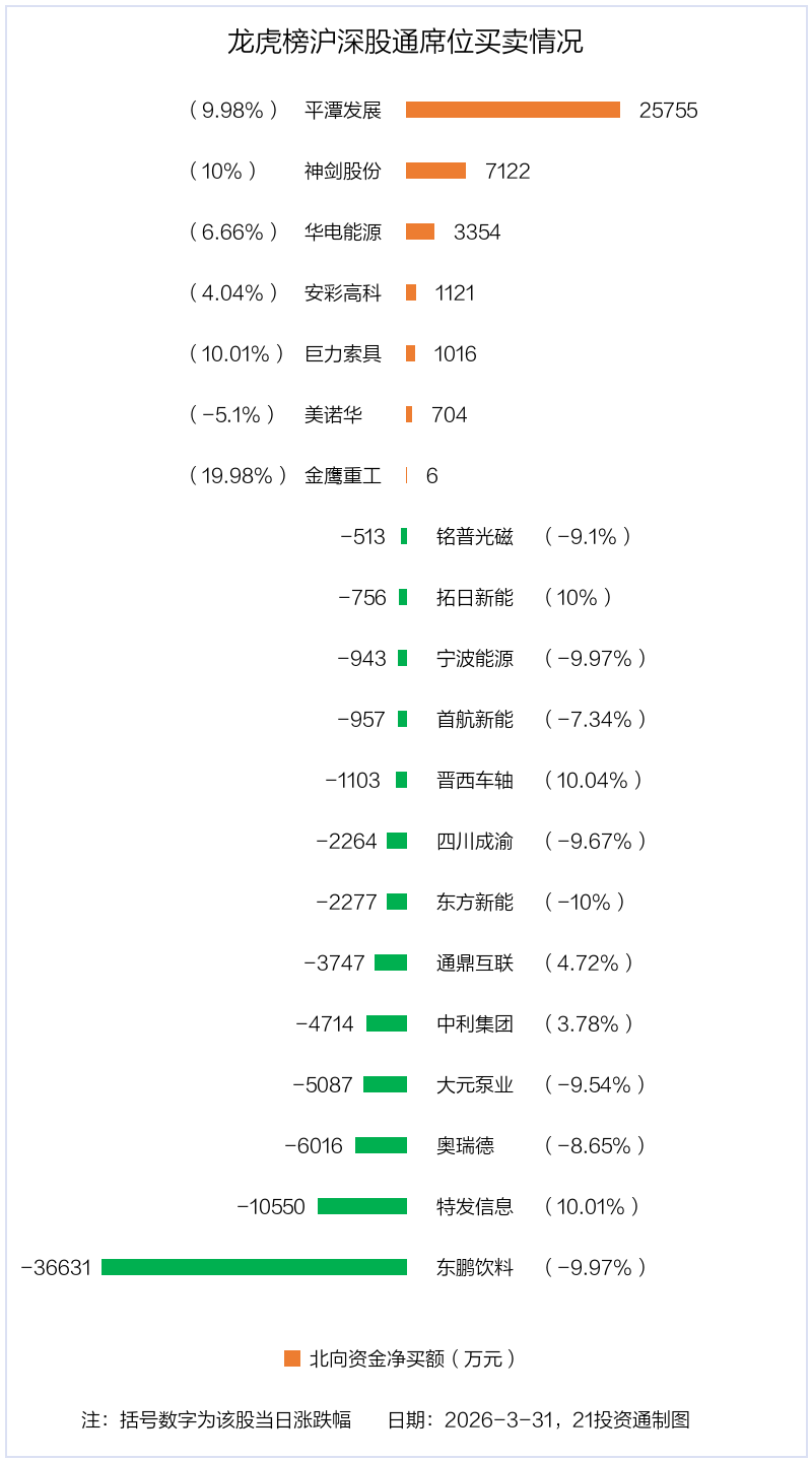 3月31日,北向资金参与龙虎榜中的个股共有20只,合计净卖出3.65亿元。其中沪股通净买入3 股,净卖出6 股,合计净卖出4.69亿元;深股通净买入4 股,净卖出7 股,合计净买入1.04亿元。