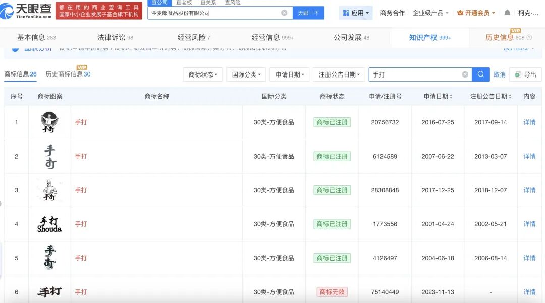 知识产权信息显示,今麦郎食品股份有限公司在2004年到2023年间陆续注册了多个“手打”字样的商标,属于方便食品系列。