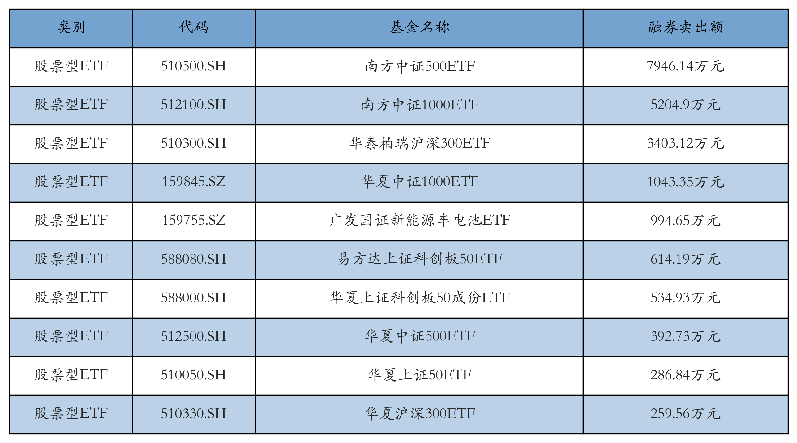 昨日股票型ETF融资卖出额最高的3只ETF及其卖出金额分别为:南方中证500ETF(7946.14万元)、南方中证1000ETF(5204.9万元)、华泰柏瑞沪深300ETF(3403.12万元)。融券卖出额前10详情见下表: