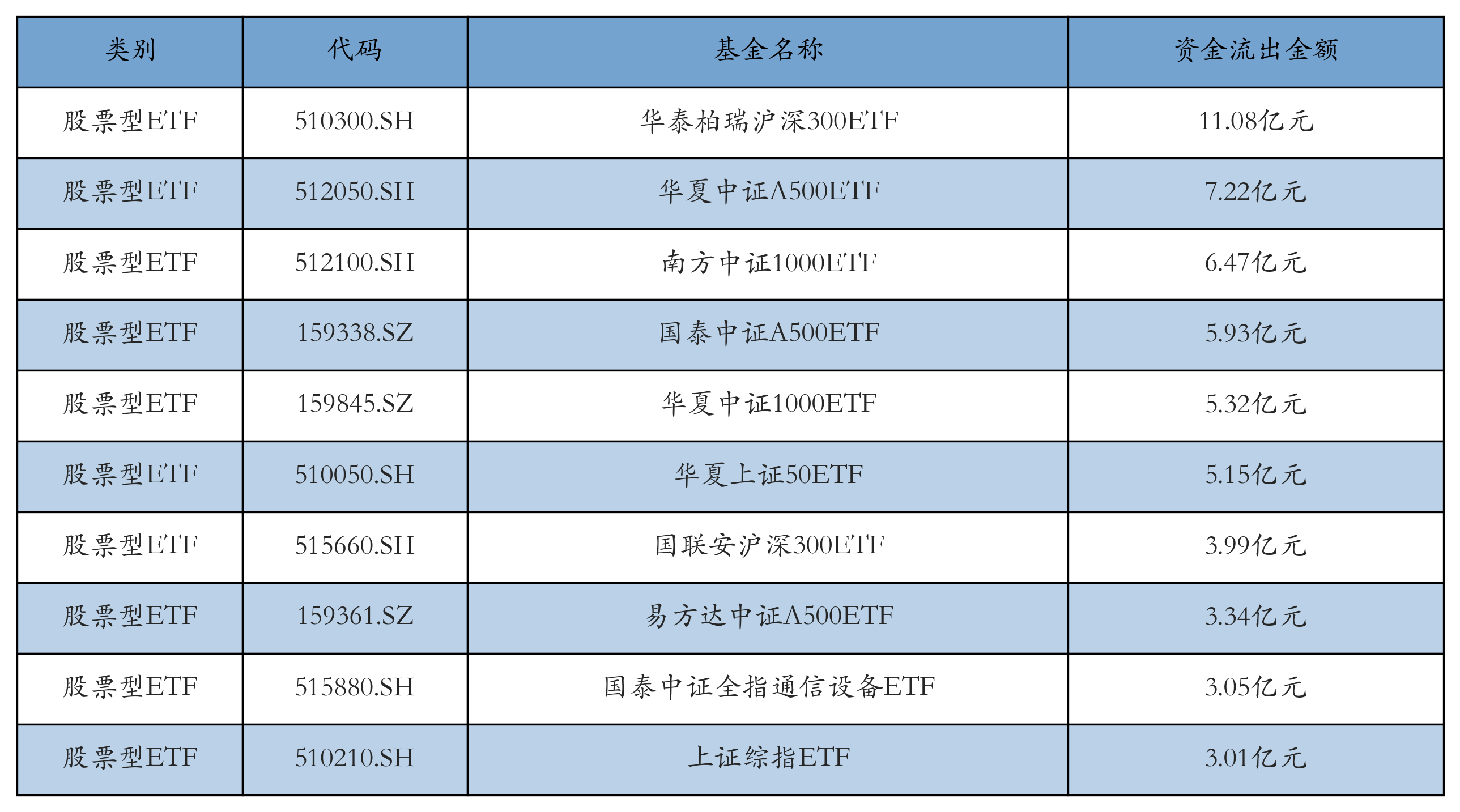 昨日股票型ETF资金流出最多的3只ETF及其流出金额分别为:华泰柏瑞沪深300ETF(流出11.08亿元)、华夏中证A500ETF(流出7.22亿元)、南方中证1000ETF(流出6.47亿元)。资金流出前10详情见下表: