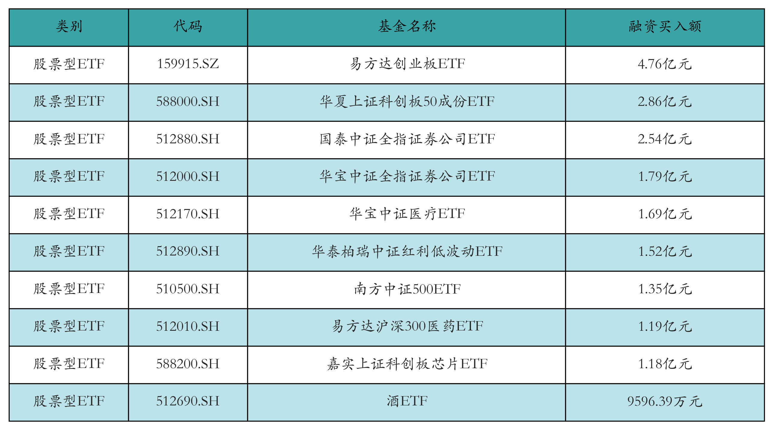 昨日股票型ETF融资买入额最高的3只ETF及其买入金额分别为:易方达创业板ETF(4.76亿元)、华夏上证科创板50成份ETF(2.86亿元)、国泰中证全指证券公司ETF(2.54亿元)。融资买入额前10详情见下表: