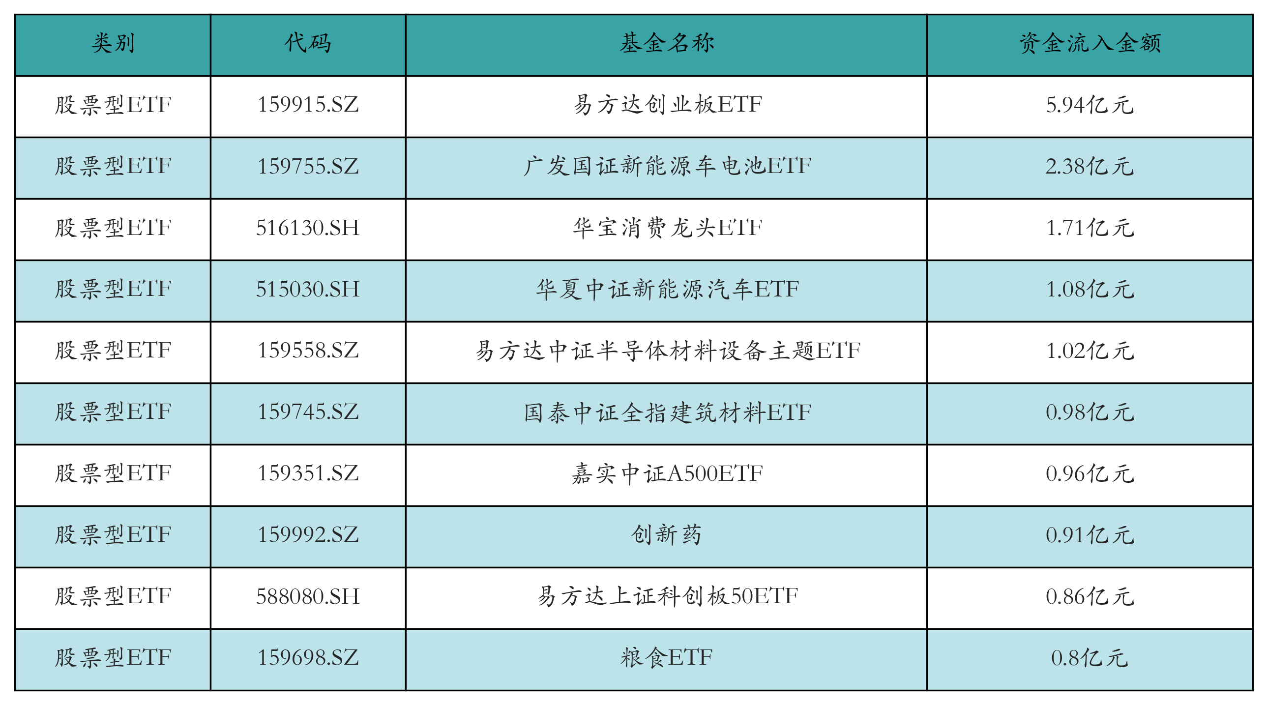 昨日股票型ETF资金流入最多的3只ETF及其流入金额分别为:易方达创业板ETF(流入5.94亿元)、广发国证新能源车电池ETF(流入2.38亿元)、华宝消费龙头ETF(流入1.71亿元)。资金流入前10详情见下表: