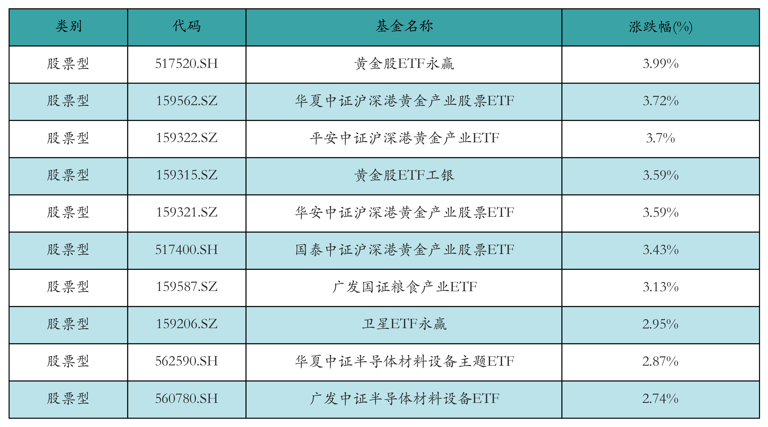 昨日股票型ETF涨幅最高的3只ETF及其收益率分别为:黄金股ETF永赢(3.99%)、华夏中证沪深港黄金产业股票ETF(3.72%)、平安中证沪深港黄金产业ETF(3.7%)。涨幅前10详情见下表: