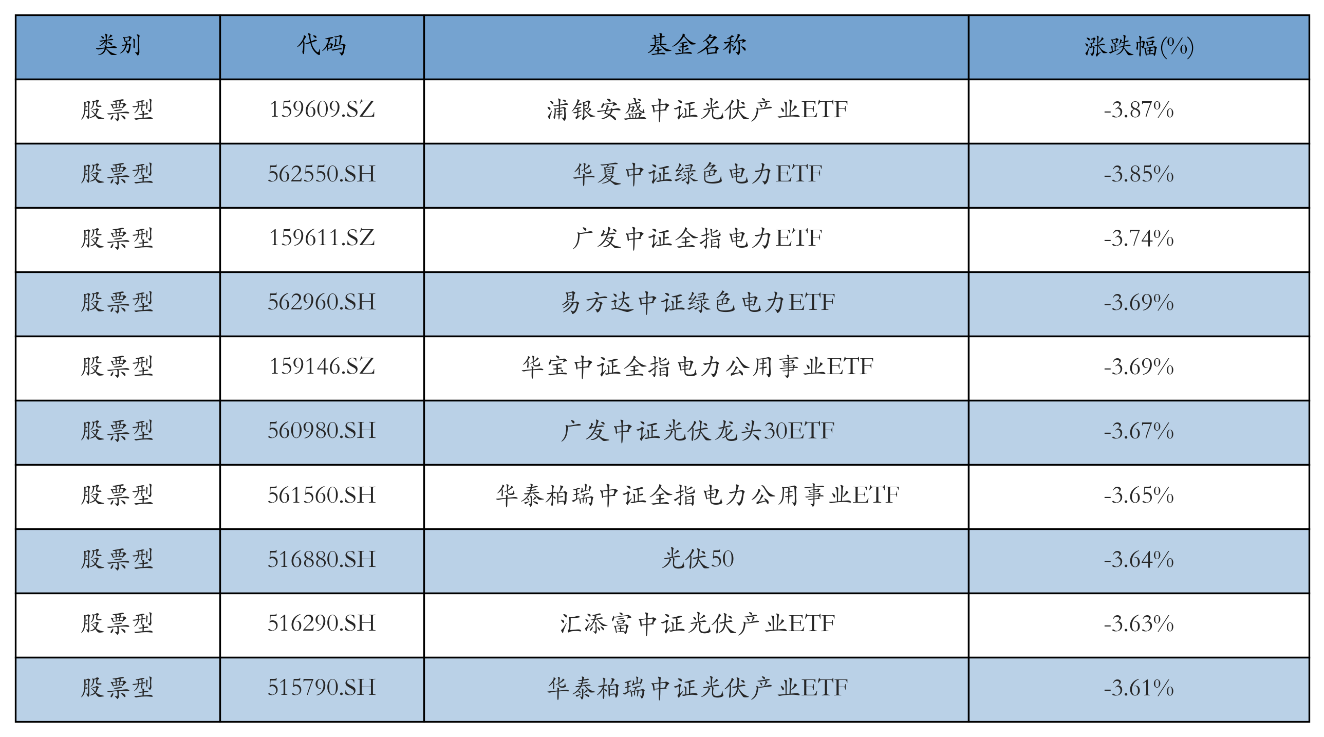 昨日股票型ETF跌幅最大的3只ETF及其收益率分别为:浦银安盛中证光伏产业ETF(-3.87%)、华夏中证绿色电力ETF(-3.85%)、广发中证全指电力ETF(-3.74%)。跌幅前10详情见下表: