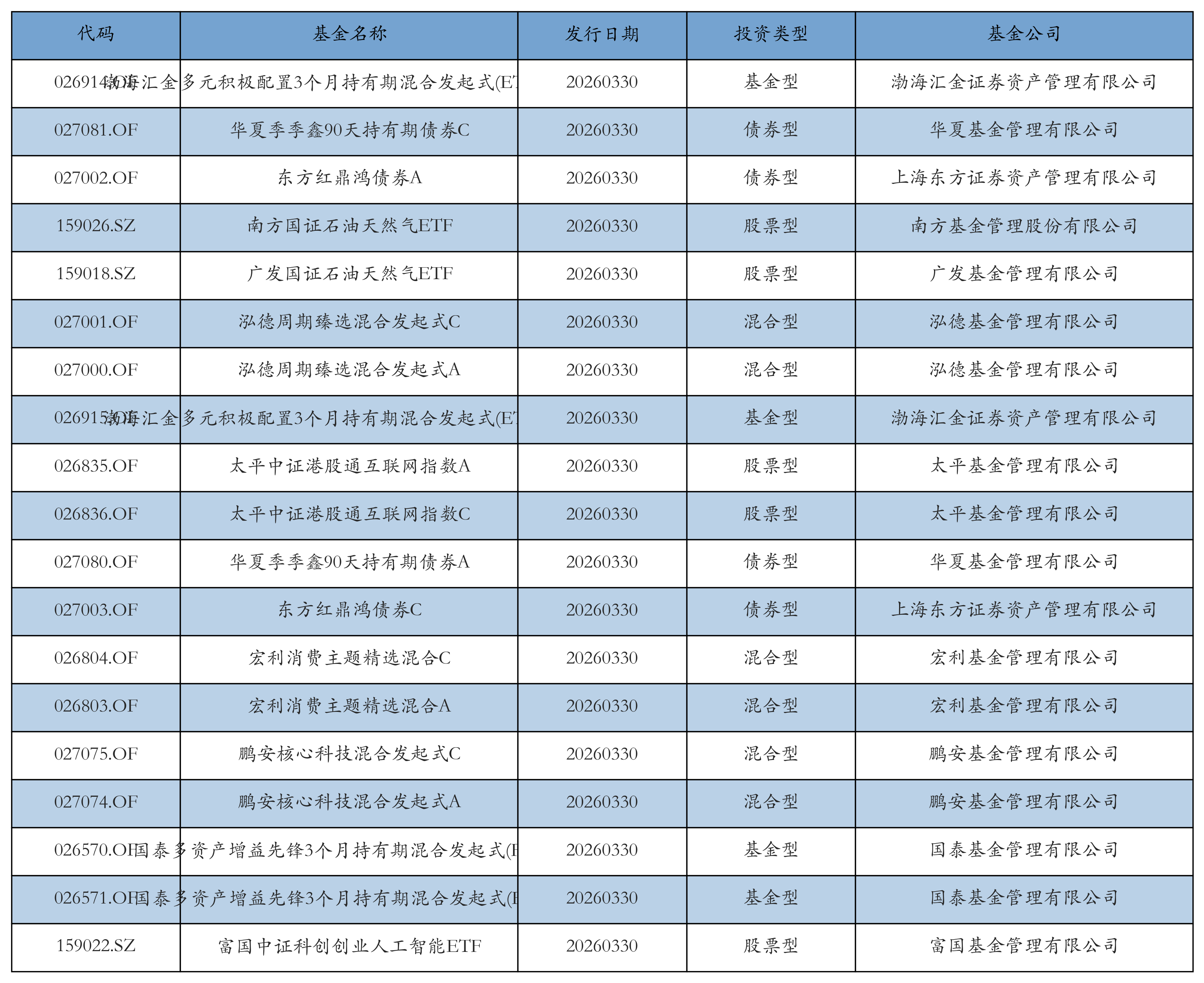 昨日有19只新基金发行,分别为:渤海汇金多元积极配置3个月持有期混合发起式(ETF-FOF)A、华夏季季鑫90天持有期债券C、东方红鼎鸿债券A、南方国证石油天然气ETF、广发国证石油天然气ETF、泓德周期臻选混合发起式C、泓德周期臻选混合发起式A、渤海汇金多元积极配置3个月持有期混合发起式(ETF-FOF)C、太平中证港股通互联网指数A、太平中证港股通互联网指数C、华夏季季鑫90天持有期债券A、东方红鼎鸿债券C、宏利消费主题精选混合C、宏利消费主题精选混合A、鹏安核心科技混合发起式C、鹏安核心科技混合发起式A、国泰多资产增益先锋3个月持有期混合发起式(FOF)A、国泰多资产增益先锋3个月持有期混合发起式(FOF)C、富国中证科创创业人工智能ETF,详情见下表: