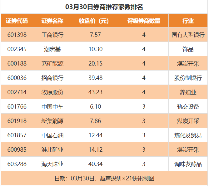从券商推荐家数来看,3月30日有111家上市公司得到券商推荐,其中工商银行、潮宏基、兖矿能源等获得4家推荐。