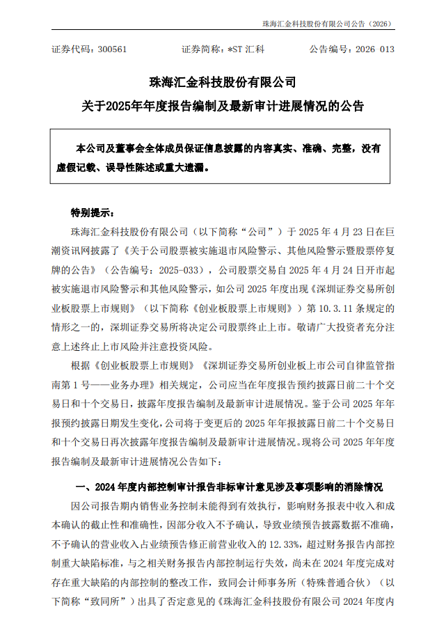 距离年报披露截止日已不足半月,身处退市风险警示边缘的*ST汇科(300561)近日再度发布审计进展公告。3月26日,该公司披露了《关于2025年年度报告编制及最新审计进展情况的公告》,就内部控制缺陷整改、年报审计进展等关键事项向市场作出说明。值得注意的是,公司因业绩预告存在误导性陈述此前已收到行政处罚,相关受损的投资者仍可依法主张权利,持续关注后续进展。