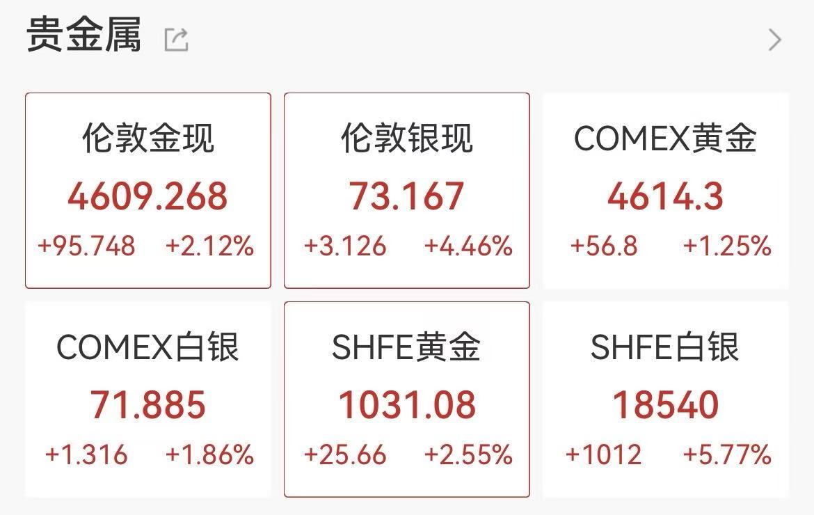 3月31日盘中,黄金与白银齐涨,截至9:40,伦敦银现达73.167美元/盎司,涨幅达4.46%。伦敦金现重回4600美元/盎司,向上触及4609.268美元/盎司,日内涨超2%。