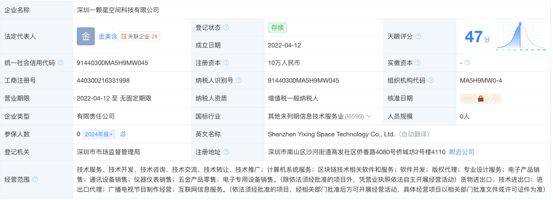 天眼查信息显示,深圳一颗星空间科技有限公司法定代表人金美含,同时是汇联智芯(上海)企业管理合伙企业的执行事务合伙人。该公司成立于2026年3月19日,金美含持股80%,汇芯二十二期股权投资(南平)合伙企业(有限合伙)持股20%。