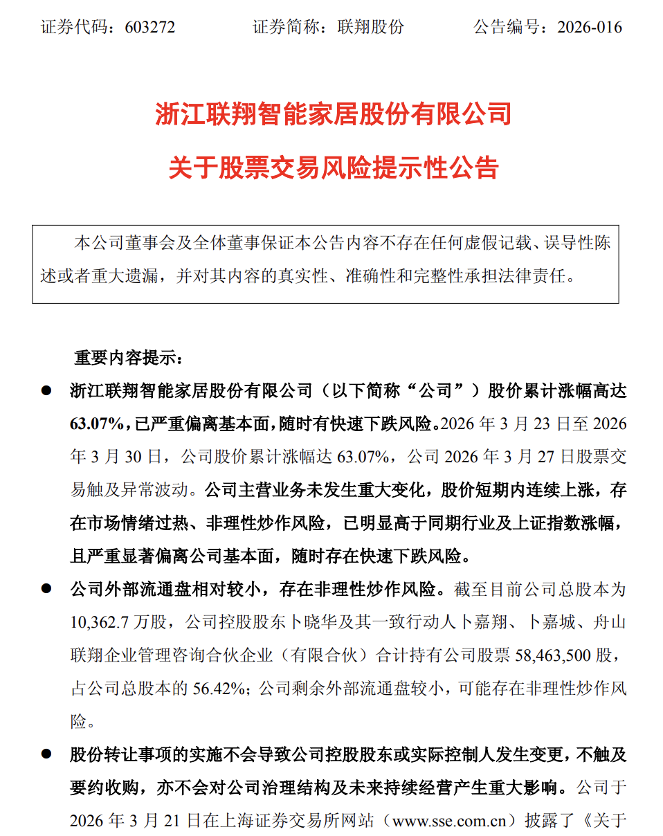 3月23日至3月30日,联翔股份股价累计涨幅达63.07%。公司在公告中表示,公司股价表现“已严重偏离基本面,随时有快速下跌风险”。