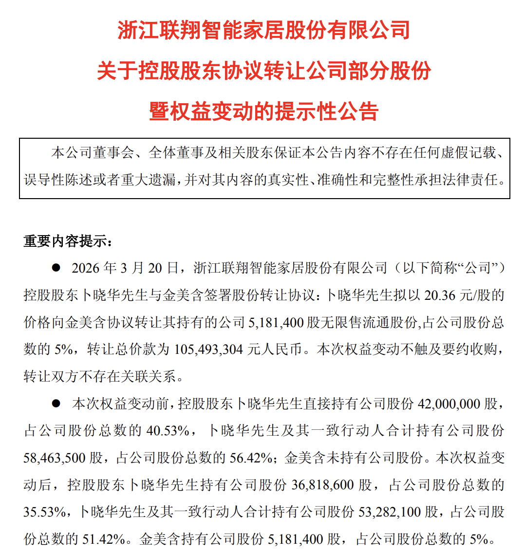 3月20日晚,联翔股份公告称,公司控股股东卜晓华与金美含签署股份转让协议,拟以20.36元/股的价格,向金美含协议转让其持有公司的5%股份,转让总价款为1.05亿元。转让价款将全部来自受让人自有资金,标的股份过户登记完成后的12个月内不得减持。