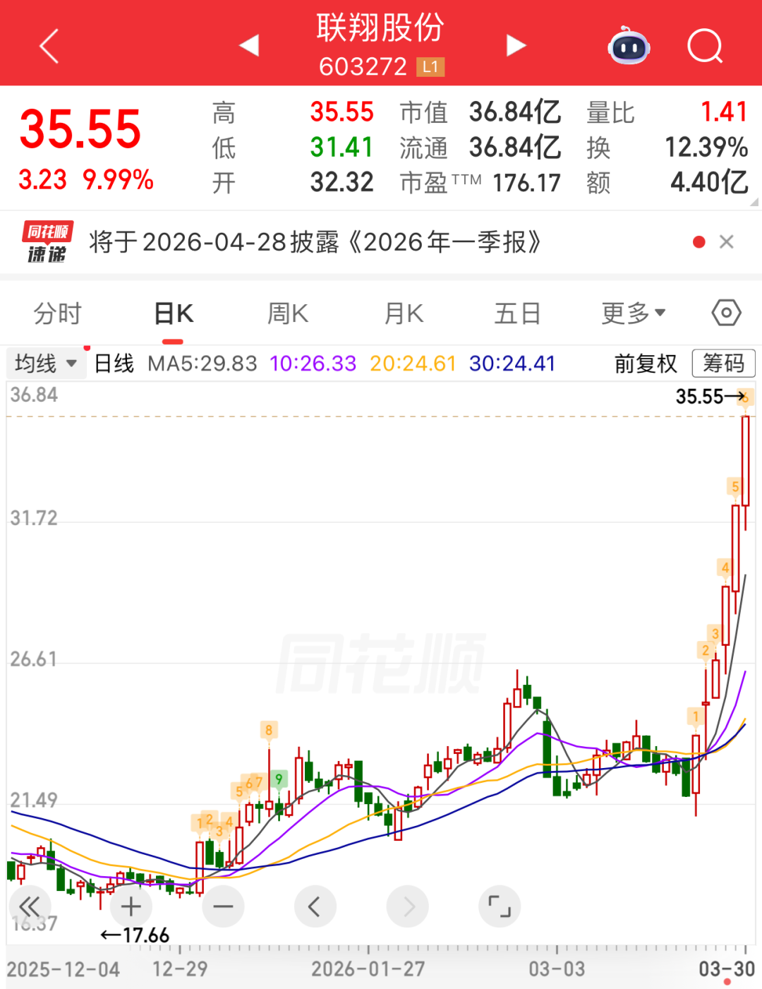 同花顺数据显示,3月30日,联翔股份股价收报35.55元/股,创历史新高,最新市值为36.84亿元。