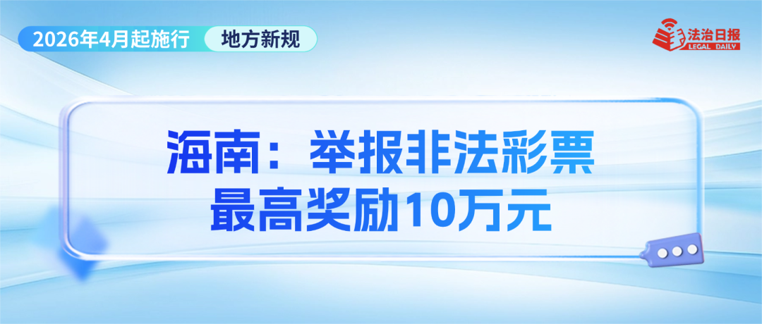 《海南省打击非法彩票举报奖励办法(试行)》4月1日起施行,规定根据案件性质、协助抓获人员级别等因素确定奖励额度,举报非法彩票查实为刑事案件的,最高奖励10万元。