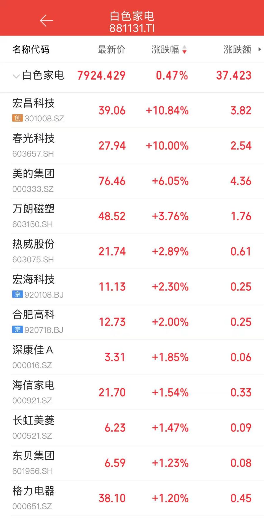 3月31日,白色家电板块逆势走强,截至午盘,春光科技涨停,宏昌科技涨超10%,美的集团涨超6%,万朗磁塑、海信家电、格力电器、长虹美菱等个股纷纷跟涨。