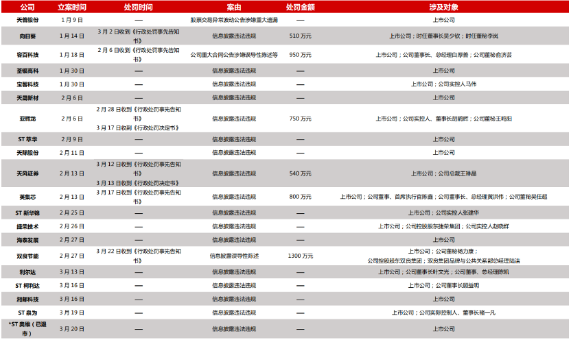 据财联社记者不完全统计,一季度A股已有至少10家上市公司因误导性陈述被监管点名。其中,双良节能、英集芯、向日葵、容百科技已收到《行政处罚事先告知书》,亚辉龙处罚决定正式落地。此外,巨力索具、杭萧钢构、国科军工、电科数字、沃格光电等多家公司因“蹭热点概念”涉嫌误导投资者被交易所予以监管警示或批评处分。