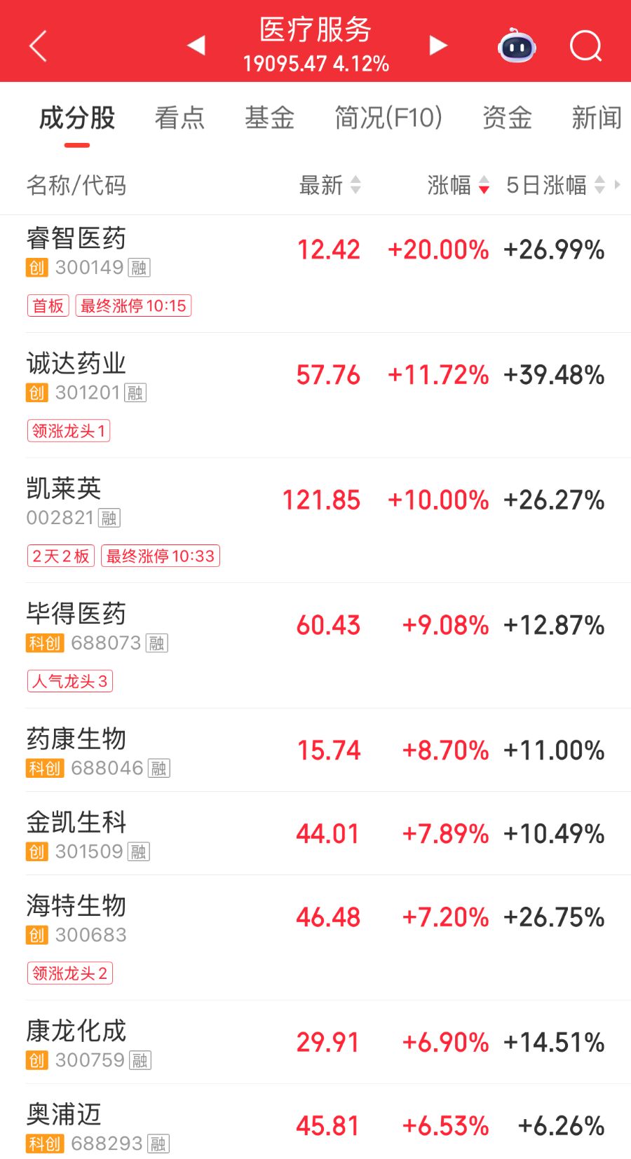 4月1日,医疗服务板块异动拉升,睿智医药盘中突然直线拉20cm涨停,诚达药业涨超10%领涨,凯莱英斩获2天2板。