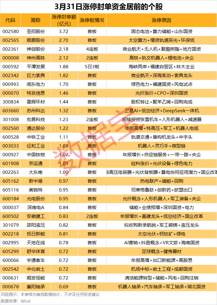 从连续涨停天数看,商业航天概念龙头神剑股份已连收4个涨停板,连续涨停板数量最多。以封单金额计算,圣阳股份、顺灏股份、神剑股份涨停板封单资金居前,分别为3.72亿元、2.7亿元、2.18亿元。