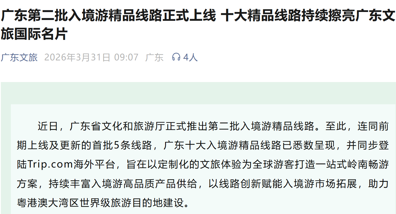 就在两地居民互访热潮涌动之际,广东省文化和旅游厅于3月31日正式推出第二批入境游精品线路。至此,连同首批5条线路,广东十大入境游精品线路悉数亮相,同步登陆Trip.com海外平台。