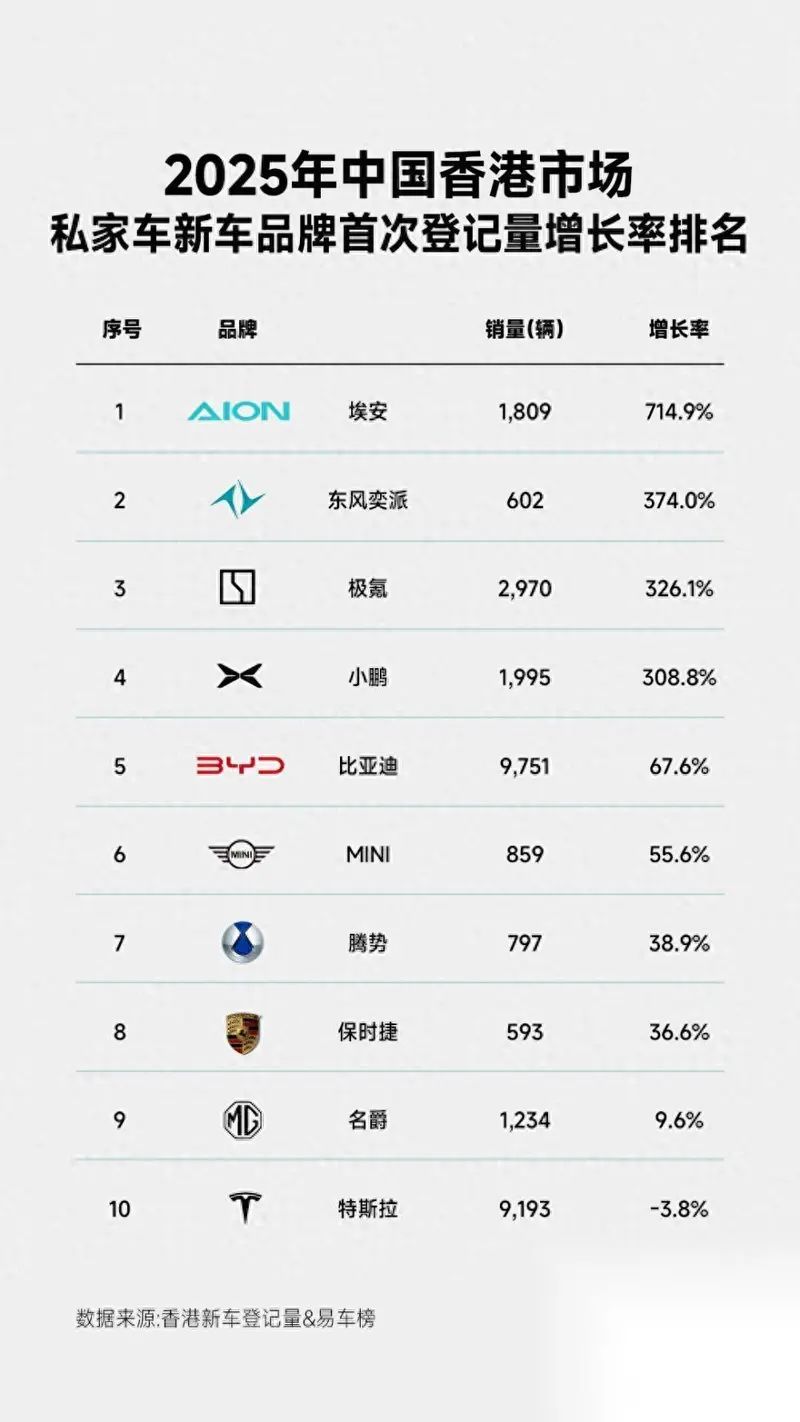 统计数据显示,2025年香港市场私家车新车品牌首次登记量增长率前10名中,有7家为国产新能源车企,分别为埃安、东风奕派、极氪、小鹏、比亚迪、腾势、名爵。香港运输署数据则显示,2025年,比亚迪以9751辆的新车登记量超过特斯拉,首次成为香港全品牌销量冠军;同期,比亚迪海狮07EV以5680辆的成绩,成为香港年度最畅销车型。