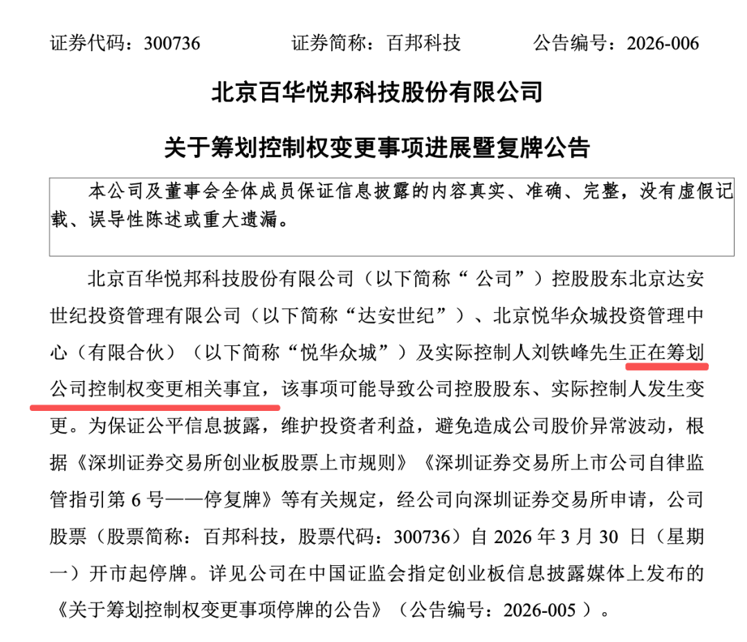 嘉华股份是国内最早的大豆蛋白生产企业之一,主要产品有大豆蛋白、大豆油、大豆膳食纤维、低温食用豆粕等。大豆蛋白产品广泛应用于肉制品、休闲豆制品、乳制品、营养制品、火锅料、烘焙制品、宠物食品、特医膳食和医药等多个领域。 2025年前三季度,嘉华股份实现营业收入10.27亿元,同比下降7.19%;实现归母净利润8217万元,同比增长7.46%。 2025年三季报显示,嘉华股份第一大股东为张冠玲,其直接持股比例为13.6%。截至3月31日,嘉华股份市值约27亿元。 3月31日晚,A股苹果售后服务商百邦科技(300736)披露控制权变更进展。