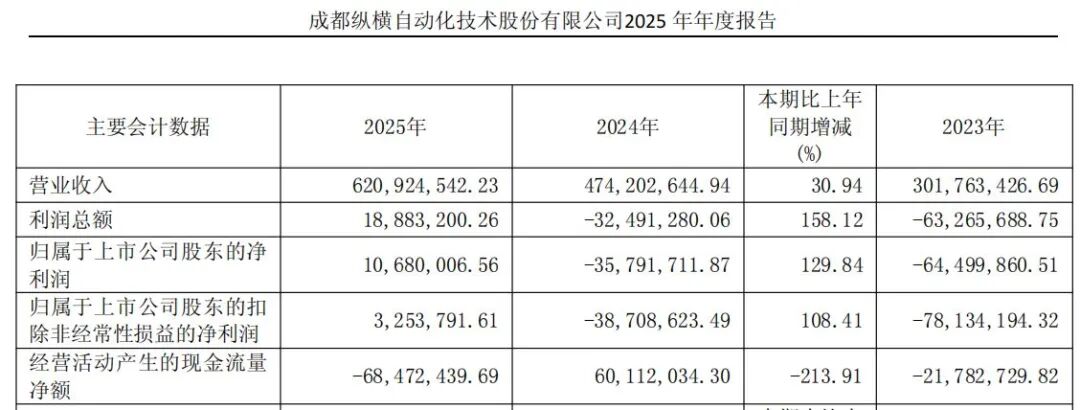 年报显示,纵横股份2025年实现营业收入6.21亿元,同比增长30.94%;归属于上市公司股东的净利润1068万元,同比扭亏为盈。