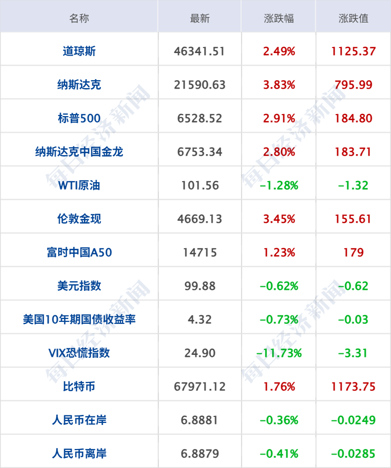 美股三大指数大幅收涨,纳指涨3.83%,标普500指数涨2.91%并创去年5月以来最佳单日表现,道指涨1125点,涨幅2.49% ;月线方面,纳指本月仍累计下跌4.75%,标普500指数累跌5.09%,道指累跌5.38%;科技股反弹,闪迪涨超10%,西部数据涨超7%,英特尔涨超7%,甲骨文涨6%,英伟达、博通、谷歌涨超5%。 中概股普遍上涨,纳斯达克中国金龙指数涨2.8% ,蔚来涨逾9%,禾赛科技涨近8%,爱奇艺涨超6%,世纪互联涨逾5%,唯品会跌超1%。