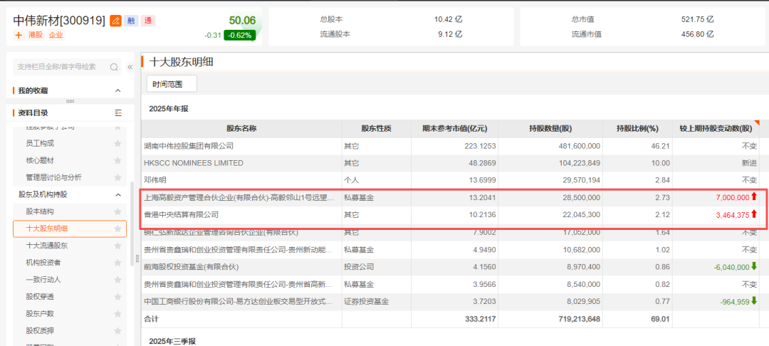 3月31日,中伟新材发布的2025年度报告显示,截至2025年末,高毅邻山1号远望基金持有该公司2850万股,期末持股市值为13.2亿元,相较于去年三季度末增持700万股。去年四季度同样加仓的还有“聪明钱”,香港中央结算有限公司增持中伟新材346.4万股。