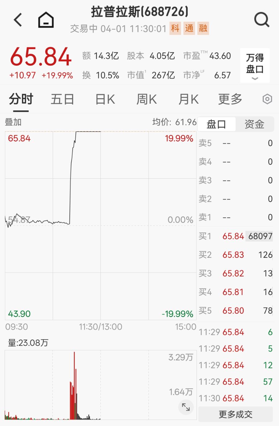4月1日早盘,拉普拉斯股价直线飙涨。截至午间收盘,拉普拉斯报65.84元/股,涨19.99%。
