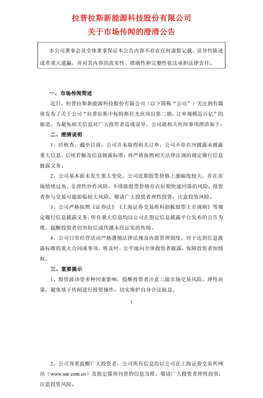 拉普拉斯今日午间公告称,截至目前,公司并未取得相关订单,不存在应披露未披露重大信息;公司基本面未发生重大变化,近期股价涨幅较大,存在市场情绪过热、非理性炒作风险,不排除股价短期快速回落可能;公司所有重大信息均以在指定信息披露平台发布的公告为准,提醒投资者勿轻信或传播未经证实的传闻。