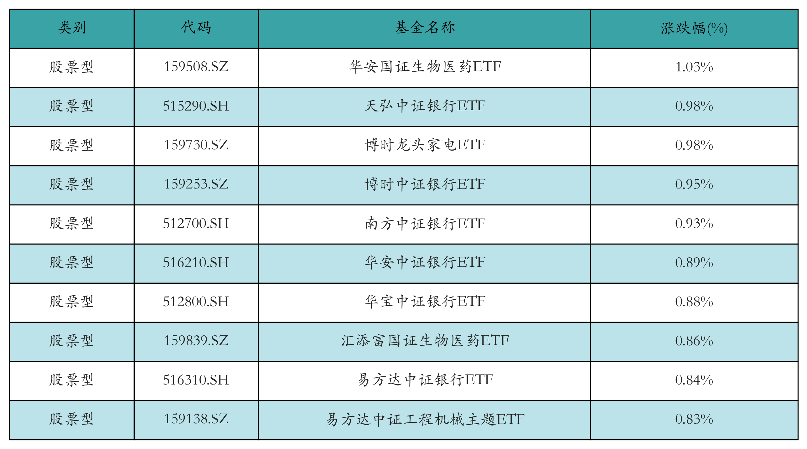昨日股票型ETF涨幅最高的3只ETF及其收益率分别为:华安国证生物医药ETF(1.03%)、天弘中证银行ETF(0.98%)、博时龙头家电ETF(0.98%)。涨幅前10详情见下表: