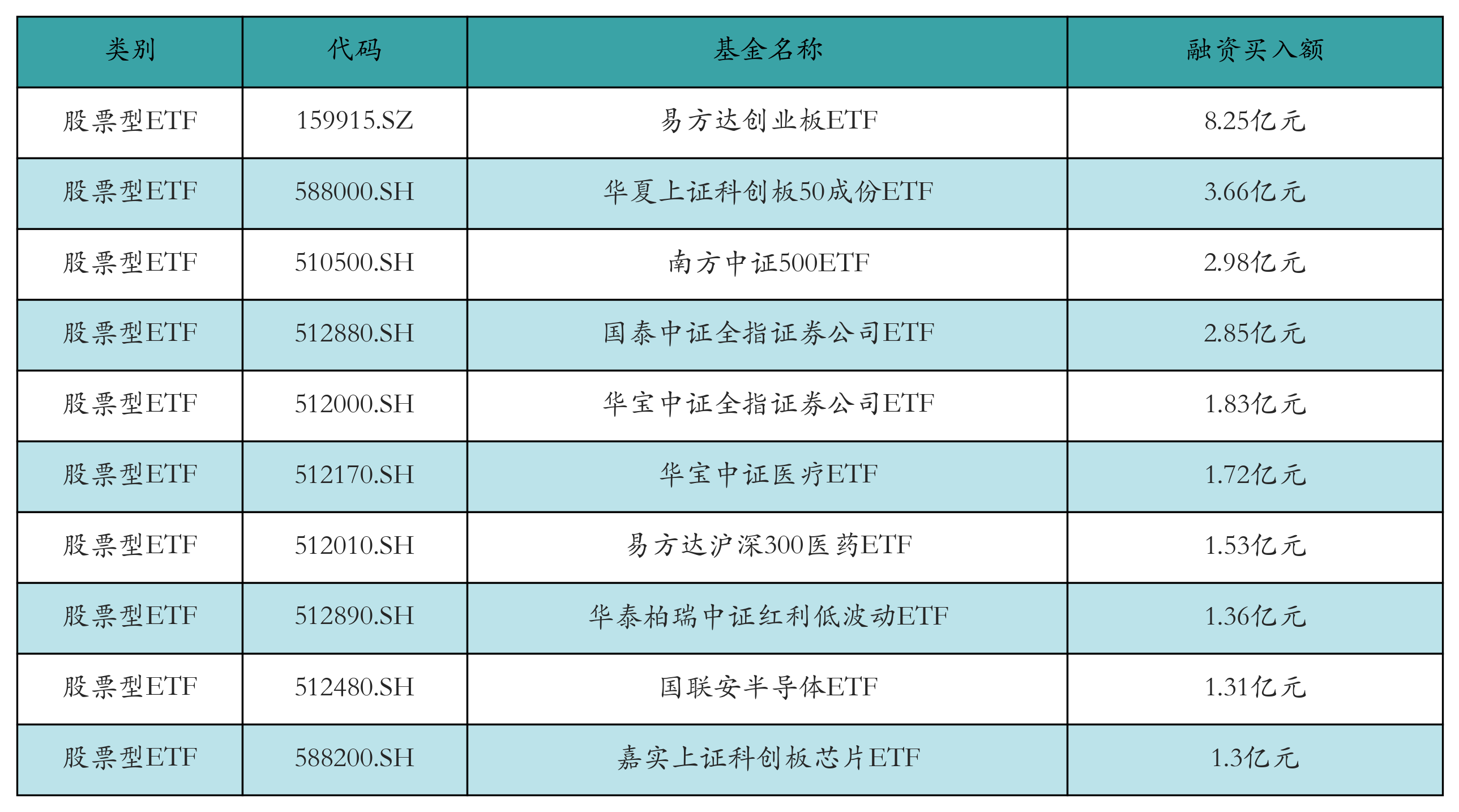 昨日股票型ETF融资买入额最高的3只ETF及其买入金额分别为:易方达创业板ETF(8.25亿元)、华夏上证科创板50成份ETF(3.66亿元)、南方中证500ETF(2.98亿元)。融资买入额前10详情见下表: