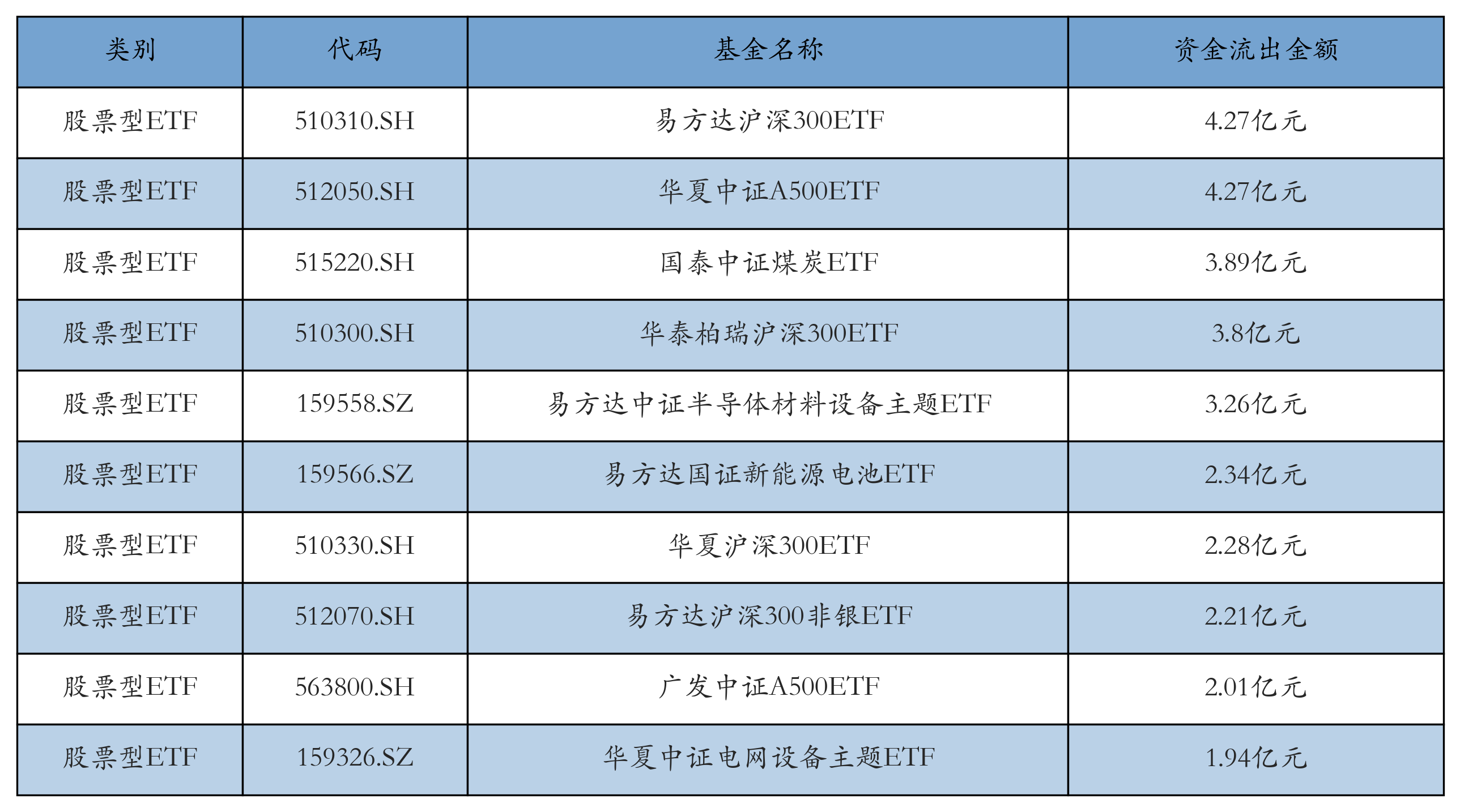 昨日股票型ETF资金流出最多的3只ETF及其流出金额分别为:易方达沪深300ETF(流出4.27亿元)、华夏中证A500ETF(流出4.27亿元)、国泰中证煤炭ETF(流出3.89亿元)。资金流出前10详情见下表: