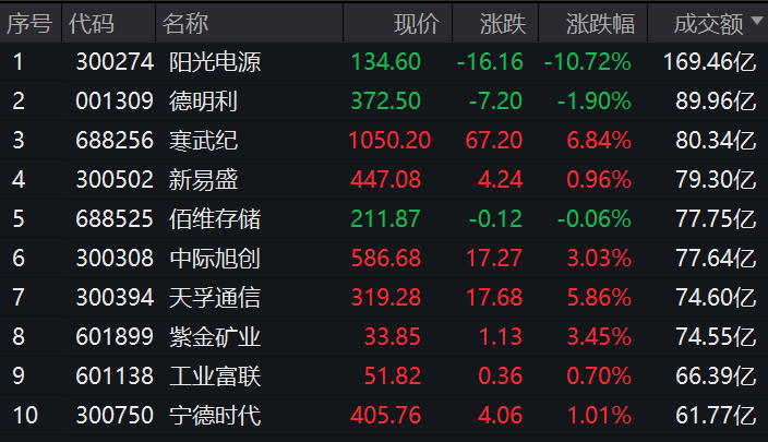 个股方面,阳光电源半日成交额超169亿元居首,德明利、寒武纪、新易盛成交额靠前。