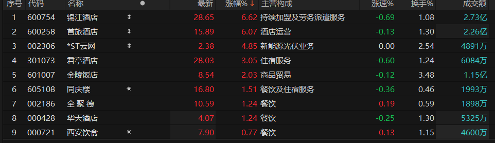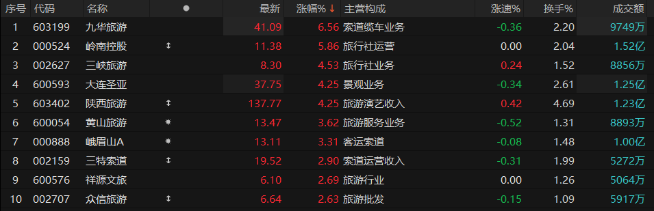 此外,旅游及景区板块盘中触底拉升翻红,九华旅游涨超6%,岭南控股、三峡旅游、大连圣亚、陕西旅游等跟涨。