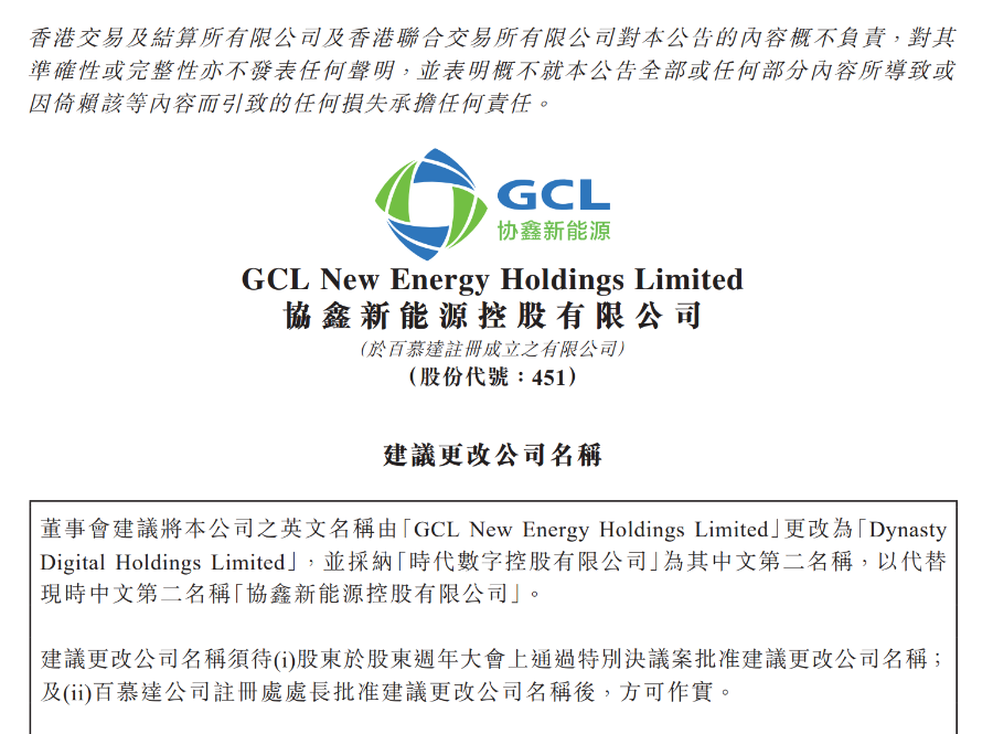 3月30日晚间,协鑫新能源发布公告称,计划更名为“时代数字控股有限公司”,理由是:主动顺应数字经济与新能源产业融合发展趋势,深度融合AI大模型与Web3.0技术。